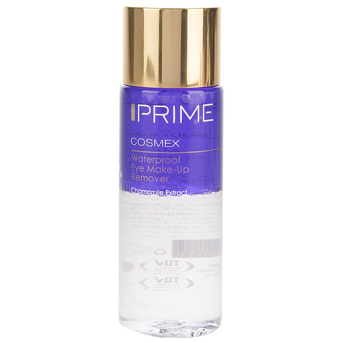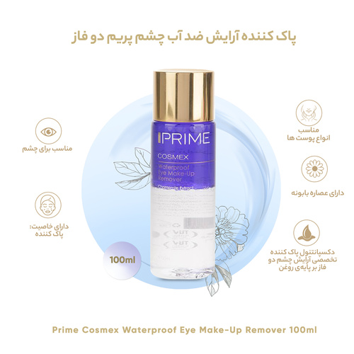 پاککننده آرایشی دوفاز چشم پرایم جهت پاک کردن آرایش چشم به بازار عرضه شده و با انواع پوستها سازگاری دارد. این محصول با اثر پاککنندگی بالا آرایش چشم را بهراحتی پاک میکند و اثری از سیاهی در دور چشم شاهد نخواهید داشت. با استفاده از یک پد و یا پنبه خشک آغشته شده به این محلول اثر پاک شدن موثرذتر خواهد بود. شرکت پرایم تولید کننده محصولات بهداشتی است که در این زمینه موفق عمل کرده چرا که نیاز مشتریان خود را سنجیده است. این پاککننده حاوی عصاره بابونه و پرو ویتامین B5 است. عصاره بابونه و ویتامین B5 موجود در این محصول در ضدعفونی و برطرف کردن التهابهای پوستی اثر دارد و به ترمیم آسیبهای سطحی پوست کمک میکند. این محصول با قابلیت دو فاز بودن اثر پاک کنندگی را افزایش داده است؛ دو فاز بودن به این معنی است که قبل از استفاده حتما باید محلول را تکان داد تا محلول به صورت یکدست شود و آن زمان قابل استفاده خواهد بود. پاککننده دوفاز پرایم با پایهی سیلیکونی حالت ابریشمی بر روی سطح پوست پس از مصرف ایجاد میکند که حس سبکی و طراوت را به شما بازمیگرداند. محلول پاککننده آرایش چشم پرایم مدل «Cosmex Waterproof Eye Make-Up Remover» با حجم 100 میلیلیتر جهت پاک کردن آرایش چشم و لب قابل استفاده است که اثری از سیاهی را در اطراف چشم بر جای نمیگذارد.