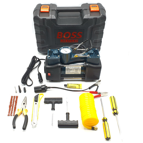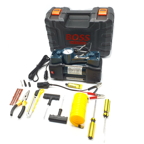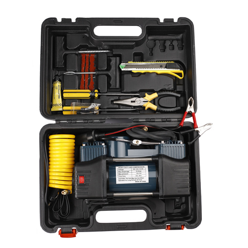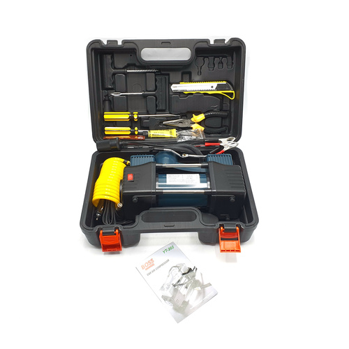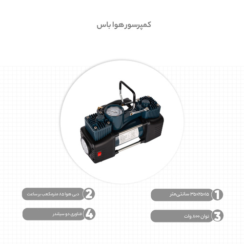 ✔ دارای متعلقات کاربردی؛ شلنگ فنری به طول 1.5 متر، دمباریک، کاتر، انبرک های پنچر گیری، پیچ گوشتی دوسو و چهارسو، وصله پنچرگیری، چسب پنچرگیری، تبدیل فندکی به سر باتری خودرو، سه عدد سری (جهت باد زدن توپ، دوچرخه، قایق بادی و ...)