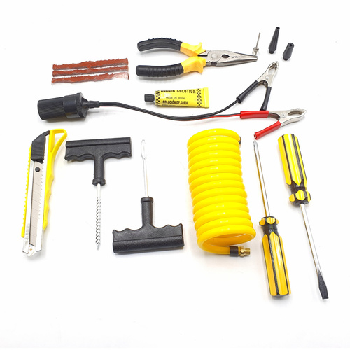 اقلام همراهدارای متعلقات کاربردی؛ شلنگ فنری به طول 1.5 متر، دمباریک، کاتر، انبرک های پنچر گیری، پیچ گوشتی دوسو و چهارسو، وصله پنچرگیری، چسب پنچرگیری، تبدیل فندکی به سر باتری خودرو، سه عدد سری