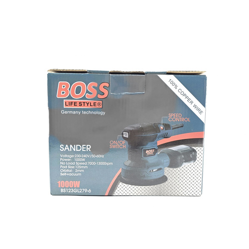 سنباده لرزان گرد ( اوربیتال ) باس سنباده زدن یکی از فرایندهایی است که معمولا در بخش پایانی کار انجام می‌شود و موجب یکدست شدن آن می‌گردد. برای این منظور می‌توانید از دستگاه سنباده‌زن BOSS باس استفاده کنید. محصول فوق یکی از انواع این دستگاه‌ها بوده که کار سنباده زدن را بسیار آسان نموده و به آن سرعت می‌بخشد. این دستگاه برقی موتوری 1000 واتی دارد که به دستگاه این امکان را می‌‎دهد با سرعتی بالغ‌بر7000_ 13000 دور بر دقیقه حرکت در دقیقه لرزش داشته باشد. شرکت «باس» برای این محصول از یک کلید قطع و وصل استفاده کرده تا بدون نگه داشتن شستی آن، دستگاه را در حالت روشن قرار دهید. به همراه این دستگاه سنباده‌زن یک محفظه جمع‌آوری گرده و براده قرار دارد تا محیط اطراف کمتر کثیف شود؛ از سویی دیگر 1 ورق صفحه سنباده برای نصب روی دستگاه عرضه شده است. شرکت باس این محصول را با نام BS123GL279-6 به بازار عرضه می‌کند.