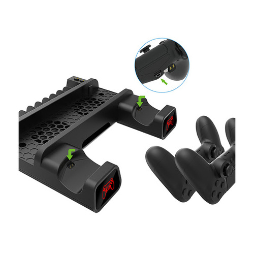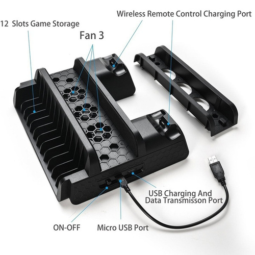 امکانات و قابلیت‌هاخنک نگه‌داشتن کنسول بازی، نگهدارنده کنسول، شارژ دسته بازی - دارای 12 بخش برای نگهداری از دیسک‌های بازی - دارای دو جایگاه برای دسته‌ها و شارژ کردن آن‌ها - مجهز شده به سه فن برای خنک نگه‌داشتن کنسول - دارای یک عدد کابل USB - سطح زیرین استند دارای فوم و بدون لیز خوردن روی سطوح مختلف - ابعاد بسته‌بندی: 27 × 7.5 × 21.5 سانتی‌متر - وزن بسته‌بندی: 621 گرم