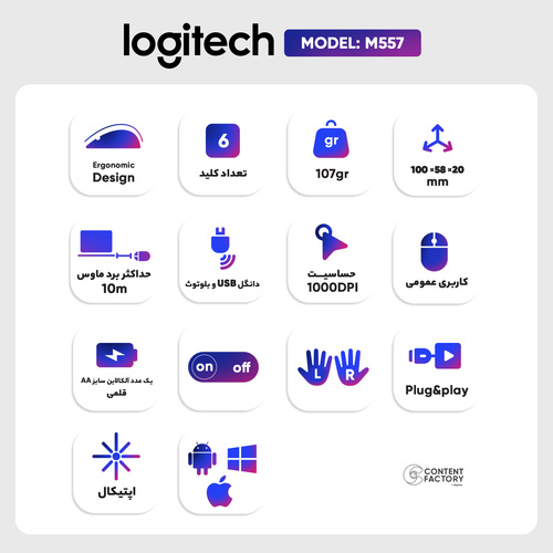 ماوس بی سیم لاجیتک مدل M557 یکی از ماوس‌های تولید شده توسط برند مشهور لاجیتک است. این برند خارجی در سال‌های اخیر با تولید محصولات با کیفیت توانسته بخش عمده‌ای از بازار لوازم و تجهیزات جانبی کامپیوتر ایران را تصاحب کند. این مدل ماوس از برند LOGITECH با بلوتوث به سیستم متصل می‌شود و با استفاده از دو باتری قلمی کار می‌کند. کار کردن با ماوس‌های بی سیم برای بسیاری از افراد راحت‌تر است به همین دلیل این مدل ماوس‌ها بسیار پرفروش‌تر از ماوس‌های دیگر هستند. حسگر استفاده شده در ساخت این مدل ماوس از نوع اپتیکال بوده، بنابراین شما به‌راحتی می‌توانید از این ماوس در سطوح مختلفی استفاده کنید. البته ما برای افزایش کارایی و دقت ماوس استفاده از ماوس پد را به شما توصیه می‌کنیم. از دیگر ویژگی‌های این مدل ماوس می‌توان به محدوده دقت 800 تا 1600 و وزن مناسب آن اشاره کرد. وزن این ماوس حدود 107 گرم است و تا فاصله 10 متری توسط کامپیوتر شما قابل‌شناسایی خواهد بود. از دیگر ویژگی‌های ممتاز این ماوس می‌توان به کلید روشن و خاموش و طراحی بی‌عیب و نقصش اشاره کرد. این مدل ماوس با هر دو دست قابل‌استفاده است و افراد چپ دست هم در حین استفاده از این مدل ماوس دچار مشکل نمی‌شوند. همچنین چهار دکمه از شش دکمه این ماوس قابل‌برنامه‌ریزی هستند و شما از طریق اپلیکیشن لاجیتک می‌توانید نقش‌های مختلفی را برای هر دکمه تعریف کنید.