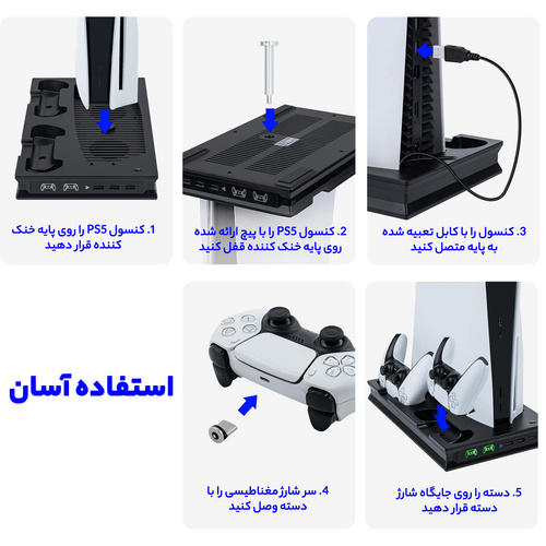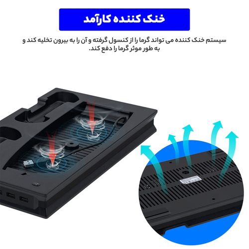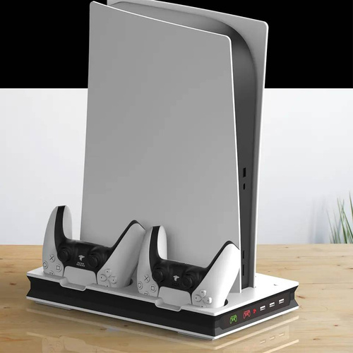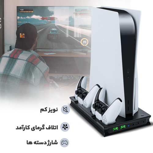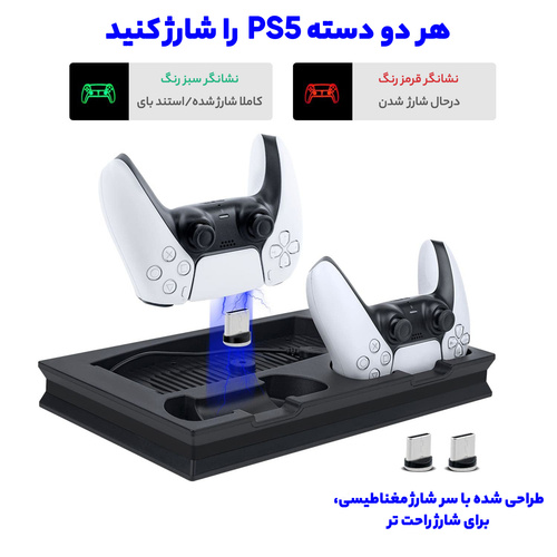امکانات و قابلیت‌هاپایه خنک کننده و شارژر دسته پلی استیشن 5 این پایه فن ساخت Shenzhen است و فاقد باتری می باشد شارژ همزمان دو کنترلر دوال سنس از طریق کابل USB و پورت USB-C زمان تکمیل شارژ 2 تا 3 ساعت مناسب پلی استیشن 5 درایودار و پلی استیشن 5 دیجیتال دارای نمایشگر LED برای نمایش مقدار شارژ