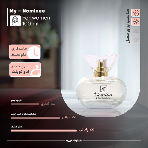 یکی از حواس پنج‌گانه‌ی ما که طی روز به‌طور مداوم و فعال محیط اطراف را پردازش می‌کند، حس بویایی است. از طریق حس بویایی محیط اطراف با ما ارتباط برقرار کرده و می‌تواند حس خوشایند یا ناخوشایندی را به ما القا کند. از آنجایی‌که بوی خوش می‌تواند هم به ما و هم به افرادی که طی روز با آن‌ها در تعامل هستیم، حس خوشایندی منتقل کند، انتخاب یک عطر مناسب اهمیت پیدا می‌کند. ادو تویلت «نومنی» (Nominee) از عطرهای MY است که برای بانوان و در حجم 100 میلی‌لیتر تولید شده و ساختار این عطر را چوب، گیاهان معطر، گل تشکیل می‌دهد. در ابتدای استفاده بوی اسطوخودوس و لیلیوم را حس می‌کنید که پس از مدتی جای خود را به گل موگه می‌دهد. این نت نیز ماندگار نیست و با گذشت زمان خواهید دید که از بین می‌رود و مشک و سدر تثبیت می‌شود.