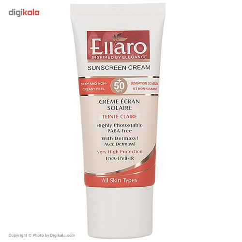 کرم ضدآفتاب برند «الارو» (Ellaro) 50 میلیلیتر حجم دارد و دارای SPF50 است که محفظهای تیوپی از جنس پلاستیک دارد. بژ روشن تن رنگی کرم ضدآفتاب الارو است. مدل «Teinte Claire» حالت کرمپودری دارد که کاربردی دوگانه برای این کرم محسوب میشود. یعنی هم در مقابل اشعههای UVB و UVA و سایر اشعههای مضر خورشید از پوست محافظت میکند و هم برای آرایش پوست و پوشاندن عیوب صورت مناسب است. میزان اسپیاف کرم الارو 50 است اما عملکردی همانند کرمهای ضدآفتاب 50 به بالا دارد وهمان محافظت را برای پوست ایجاد میکند. وجود مادهای بهنام «Dermaxyl» خاصیت ضدچروک دارد و قادر است چینوچروکهای ریز پوست را ازبین ببرد. الارو دارای ماده آبرسان جهت حفظ رطوبت پوست است که اجازه نمیدهد پوست خشک شود. کیفیت بالای محصولات الارو که دارای کد مجوز بهداشت هم هستند، این محصولات را به انتخابهایی عالی مبدل میکنند.