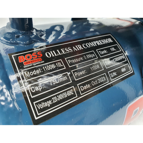 کمپرسور هوا 10 لیتری باس boss دارای تک موتور سایلنت است.فشار باد کمپرسور 8 بار میباشد میزان هوادهی در دقیقه 75 لیتر میباشد و دور موتور 2850 دور دقیقه است . 1100 وات می باشد تک موتور است دو سیلندر می باشد خروجی کوپلینگ دارد همچنین وزن 15 کیلوگرم دارد میزان صدا 70 دسی بل بوده و سیمپیچ مس است و نیز مجهز به سیستم لرزه گیر می باشد مخزن سخت کاری شده جهت جلوگیری از پوسیدگی و 2 عدد فیلتر هوا دارد و کیفیت بسیار عالی دارد.همچنین دارای شیر فشار اطمینان می باشد