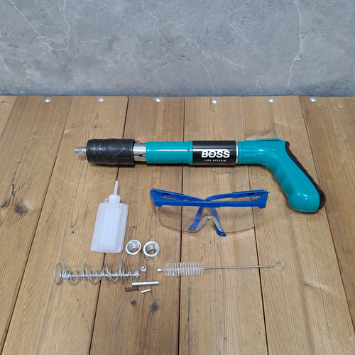 مشخصات میخکوب بتن و آهن (میخ با چاشنی انفجاری) BOSS امکان استفاده در بتن، پلاستیک، ورق های نازک فلزی، چوب و ... را دارد xقابلیت استفاده میخ تا 5 سانتیمتر را دارد xکارکرد ساده و قوی دارد xبدون نیاز به چاشنی انفجاری جداگانه می باشد xبسیار سبک، کم حجم وقابل حمل می باشد xمحصولی جدید و با تکنولوژی به روز جهت جایگزینی برای میخکوب های والتی، کامرکس و ... می باشد xبدون نیاز به چاشنی انفجاری می باشد xدارای کیف حمل، عینک، فرچه، فنر یدک می باشد تفنک میخکوب ابزاری است مشابه تفنگ بادی است. تفنگ میخکوب بتن برای اتصال پلیت ها و صفحات مختلف به بتن می باشد. البته مصارف دیگری از جمله اتصال انواع توری های مشبک و غیره به صفحه های بتنی و مصالح ساختمانی را نیز دارد. این تفنگ ها به وسیله چاشنی میخ موجود در خان تفنگ را با شدت به سمت هدف شلیک کرده و واشری که بر روی میخ قرار دارد صفحه را بر روی بتن نگه می دارد. با قرار دادن چاشنی مخصوص در داخل دستگاه و قرار دادن میخ در محل تعیینشده، میتوانید از این ابزار استفاده کنید. چاشنیهایی که برای این محصول در نظر گرفتهاند در دو نوع و برای کوبیدن میخ در فلز یا بتن هستند. نوع میخی که برای این دستگاه مورد استفاده قرار میگیرد، از گونههای واشردار است. از این دستگاه در شغلهای مختلف که با چوب و فلز سروکار دارند، استفاده میکنند.