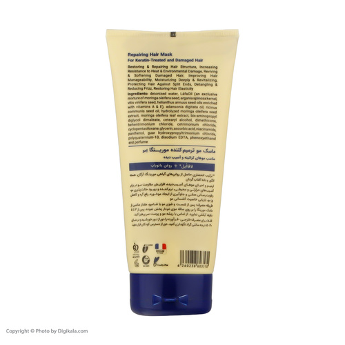 ماسک محافظ رنگ مو مورینگا امو مناسب مو رنگ شده و دکلره کد 4 ضمن ترمیم موهای آسیبدیده، سبب تثبیت و افزایش درخشندگی رنگ مو میشود. همچنین این محصول با رطوبترسانی عمقی و تامین مواد مغذی، موجب افزایش نرمی و لطافت تارهای مو و مانع از ایجاد موخوره، گره و شکنندگی تارهای مو میشود.