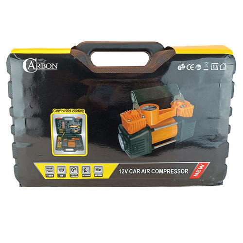 کمپرسور هوا کربن دارای موتوری با حداکثر توان 1200 واتی میباشد.با داشتن دبی هوایی معادل 85 لیتر بر دقیقه میتواند به سرعت لاستیکها و قایقهای بادی یا توپهای ورزشی شما را پر نماید. فشارسنج تعبیه شده برای این محصول به کاربران اجاز میدهد تا بدون نگرانی از ترکیدن مقدار باد مورد نیاز خود را بطور کامل پر نمایند. همچنین وجود چراغ قوه ال ای دی به کاربران امکان کار در محیطهای تاریک و کم نور یا در اوقات شب را میدهد. این ابزار به همراه مجموعهایی از ابزار مورد نیاز پنچرگیری و ابزارهای موردنیاز و ضروری در یک کیف BMC مستحکم و قابل حمل عرضه میشود. ست ابزار این مجموعه شامل سه سری نازل باد – شلنگ فنری – کیف – کاتر – 1 عدد پیچ گوشتی دوسو – یک عدد پیچ گوشتی چهارسو، یک عدد دم باریک، چسب مایع، ابزار پنچرگیری، گیره باتری خودرو به همراه کابل میباشد.