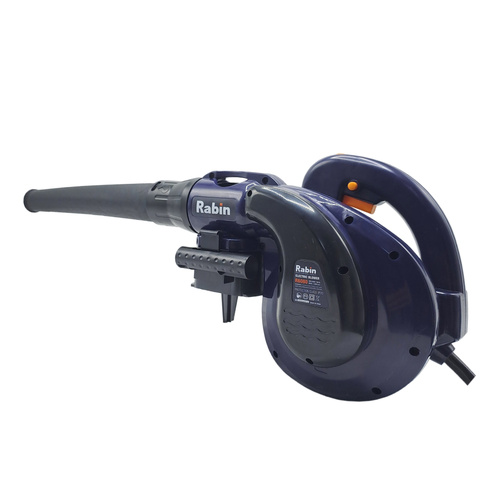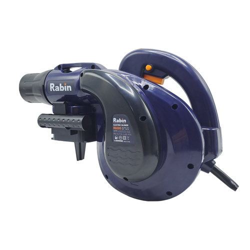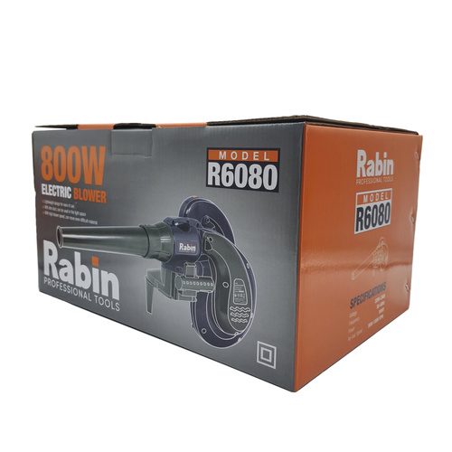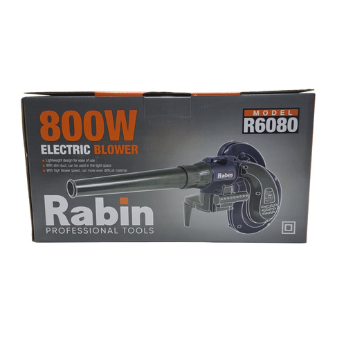 بلوور برقی وسیله ای جهت دمش هوا با قدرت بالا میباشد. این دستگاه عمدتا جهت پاکسازی محیط های مختلف استفاده بسیار بالایی دارد. بلوور برقی رابین مدل R6080 قابلیت چرخش فن از 3000دور در دقیقه تا 13000 دور در دقیقه را دارد تا هوا را با سرعت بالا به میزان 0 – 3.5 متر مکعب در دقیقه بدمد. این دستگاه دارای قدرت 800 وات میباشد تا عملیات دمندگی به راحتی و بدون فشار به دستگاه انجام شود. همچنین میتوان از این دستگاه جهت مکش نیز استفاده نمود. مهمترین ویژگی و وجه تمایز این دستگاه، وجود دیمر (کلید تغییر سرعت دمنده گی) بر روی خود بدنه میباشد تا کاربر حین کار با این دستگاه براحتی میزان دمش هوا را تنظیم نماید و نیازی به خاموش نمودن دستگاه جهت تنظیم مقدار دمش هوا نباشد. در مسیر دمش این دستگاه میتوان از لوله لاستیکی این دستگاه که داخل بسته بندی آن وجود دارد استفاده نمود تا دمش هوا متمرکزتر انجام شود و همچنین دستگاه دورتر قرار گیرد تا گرد و غبار نزدیک به کاربر نشود. این بلوور (دمنده/مکنده) دارای کلید قفل کن میباشد تا در هنگام کار برای مدت طولانی، کاربر این کلید را فشار داده و بطور طولانی و مداوم از این دستگاه استفاده نماید. تمامی مراحل ساخت موتور این دستگاه از قبیل لاک گیری، بالانس، سیم پیچی و... در آرمیچر و بالشتک این دستگاه با استفاده از دستگاه های تمام اتوماتیک مطابق با آخرین فناوری روز دنیا تولید شده تا عمر مفید دستگاه به حداکثر برسد. بعلت دور بالای این دستگاه از بلبرینک با کیفیت و تقویت شده در این دستگاه استفاده شده است. این دستگاه دارای طراحی ارگونومیک جهت خوشدستی و راحتی کاربر در حین کار طراحی شده و همچنین بدنه این دستگاه دارای عایق دوبل و از جنس PA6+GF30 که بهترین مواد جهت ساخت بدنه ابزار آلات برقی میباشد استفاده شده است. این دستگاه دارای کیسه جمع کننده گرد و غبار جهت جمع آوری گرد و غبار نیز میباشد.