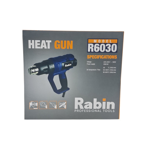 سشوار صنعتی رابین دارای سیستم تنظیم هوا و حرارت بوده که حرات کم این دستگاه 50 تا 450 درجه سانتیگراد و حرارت زیاد این دستگاه از 90 تا 600 درجه سانتیگراد میباشد. متعلقات این سشوار چهارعدد سری فلزی است. سشوار صنعتی رابین دارای موتور قدرتمند 2000 وات با آرمیچر مسی، با قابلیت (دیمر) تنظیم جریان و دمای هوای خروجی، سبک با طراحی ارگونومیک وبدنه عایق همچنین با کیفیت و ساخت فوق العاده میباشد. این سشوار از محصولات شرکت رابین بوده و این شرکت این دستگاه را با قیمت اقتصادی به بازار عرضه کرده است.