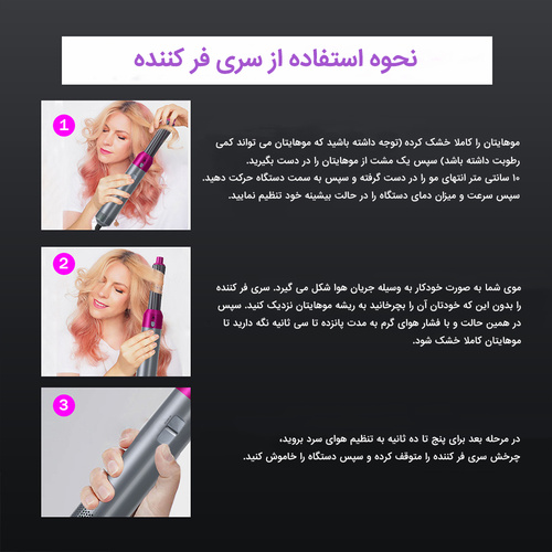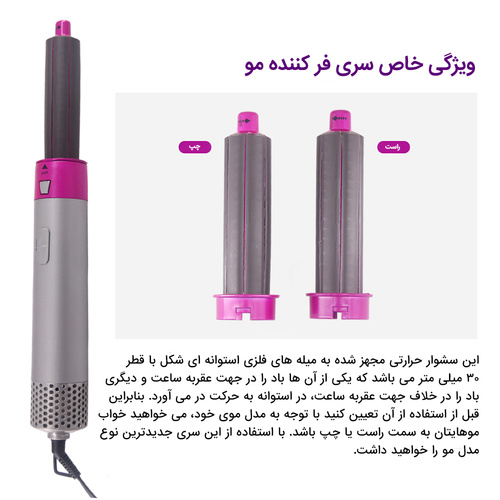 سری برس مارپیچ به شما کمک می کند تا فرهای زیبا ایجاد کنید، برس صاف به شما کمک می کند موهای وز را صاف کنید، برس گرد به شما کمک می کند مدل موی عالی ایجاد کنید. شما می توانید آن را به عنوان یک سشوار کلاسیک استفاده کنید.