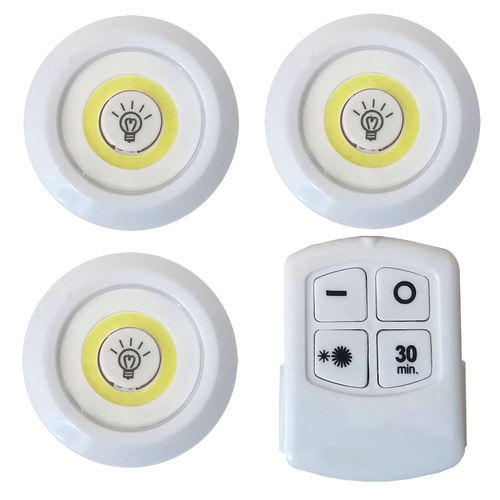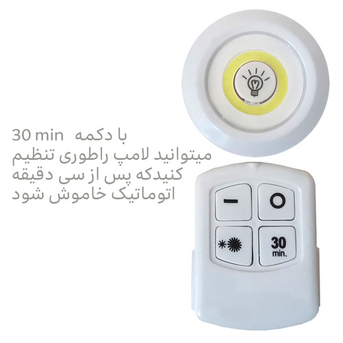 این محصول شامل سه چراغ LED بسیار پر نور به همراه یک ریموت کنترل میباشد. لامپ ها با سه باتری نیم قلمی کار میکنند. و به کمک چسب موجود پشت آن ها میتوانید به راحتی نصب نمایید. پشت پایه ریموت کنترل نیز چسب دوطرفه است که میتوانید به دیوار متصل کنید. با ریموت علاوه بر خاموش و روشن کردن میتوانید لامپ را طوری تنظیم کنید که به صورت اتوماتیک پس از سی دقیقه خاموش شود. از طرفی لامپ ها به صورت فشاری نیز خاموش و روشن میشوند. این محصول برای مواقع قطعی برق بسیار مناسب است و تمامی محیط منزل را روشن میکند.