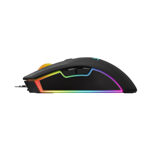 این موس طوری طراحی شده به صورت ارگونومیک جهت جلوگیری از خستگی دست ومجهز به 6 عدد کلید فیزیکی با قابلیت تنظیم DPI میباشد . مجهز به حسگر اپتیکال با حداکثر دقت 6200 نقطه بر اینچ میباشد و مجهز به نورپردازی RGB با پشتیبانی از 16 میلیون رنگ میباشد در ضمن نوع اتصال از طریق کابل با رابط USB و روکشی از جنس الیاف بهم بافته شده است که مقاوم در برابر کشش و پارگی میباشد