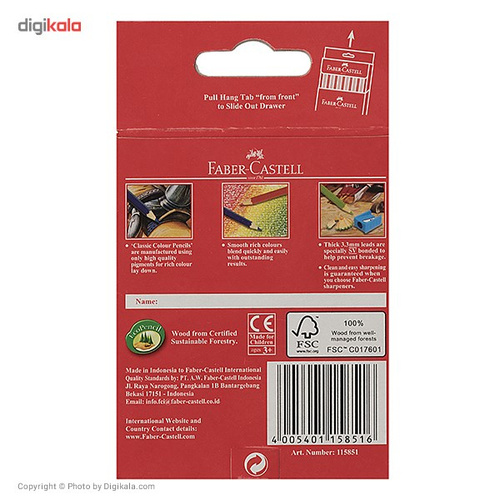 یکی از مشهورترین مدادهای رنگی در دنیا «فابرکاستل»( FaberCastell) است. مدادرنگی یکی از پرطرفدارین ابزاری است که برای رنگ آمیزی مورد استفاده قرار می گیرد. مدادرنگی فابرکاستل مدل classic از 12 رنگ آبی آسمانی، آبی، صورتی، قرمز، نارنجی، گلبهی، زرد، سبز روشن، سبز تیره، قهوه ای، مشکی وطلایی تشکیل شده است. فابرکاستل با بدنهی شش ضلعی و ارگونومیک از فشار به انگشتان فرزند شما جلوگیری می کند و اجازه نمی دهد پس از ساعتها نقاشی احساس خستگی کند. در ساخت هر مدادرنگی فابرکاستل از رنگدانه های بسیار غلیظ استفاده شده است؛ رنگهایی درخشان که بهراحتی با هم ترکیب میشوند و رنگ جدیدی ایجاد میکنند و این کشف جدید، باعث افزایش اعتماد بنفش و خلاقیت کودکان خواهد شد. طول بدنهی هر مداد 8.5 سانتیمتر است. نوک هر مداد دارای پوششی است به نام SV، که از شسکتن ان جلوگیری می کند. مدادرنگی فابرکاستل به راحتی تراشیده می شود و بهتر است از تراشهای این برند آلمانی استفاده کنید. 12مدادرنگی فابر کاستل داخل یک جعبهی مقوایی قرار گرفته اند. با خرید مدادرنگی 12 رنگ فابرکاستل مدل classic دنیایی شگفت انگیز از رنگ ها به کودکتان هدیه کنید.